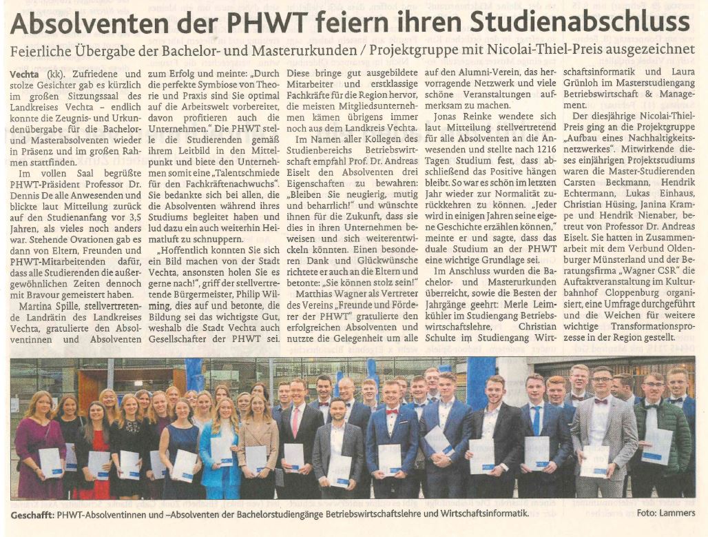 Am 27. Januar 2023 wurde im Rahmen der Abschlussfeier der Bachelor-Studiengänge Betriebswirtschaftslehre und Wirtschaftsinformatik sowie des Masterstudiengangs Betriebswirtschaft und Management der Nicolai-Thiel-Preis 2023 an die Projektgruppe „Aufbau eines Nachhaltigkeitsnetzwerkes“ vergeben.